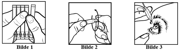 Klem forsiktig på endosebeholderen for å frigjøre en dråpe ned i lommen mellom øyelokket og øyet (bilde 3).