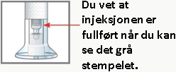 A. Etter at du trykker på den turkise injeksjonsknappen vil du høre 2 høye klikk. Det andre klikket sier fra om at injeksjonen er fullført. Du vil også se det grå stempelet i den klare bunnen.