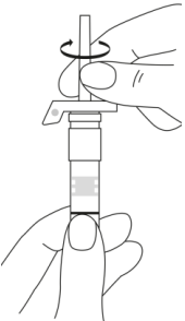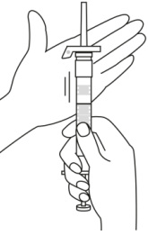 1. For å klargjøre for injeksjon holdes sprøyten rett opp (kanylen opp). Skru fast stempelet på sprøytens bunn til den bakerste gummiproppen begynner å snurre.
