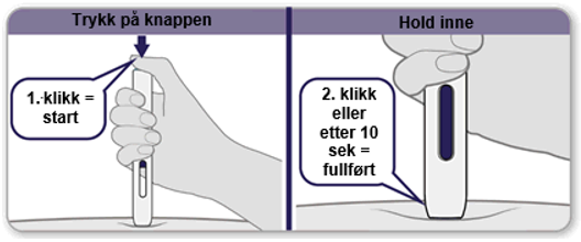 Merk: Hvis du ikke klarer å starte injeksjonen som beskrevet, skal du trykke pennen hardere mot huden og trykke på den grå knappen på nytt.