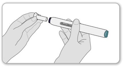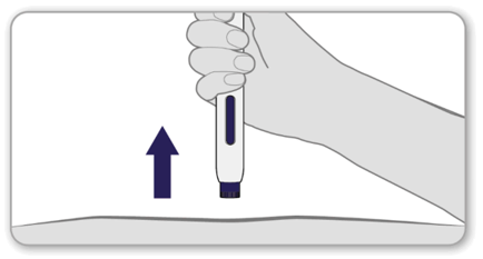 Etter at hetten har blitt fjernet, vil du se en lilla kanylebeskyttelse som stikker litt ut fra enden av pennen. Ikke skyv på kanylebeskyttelsen på enden med fingrene eller tommelen.