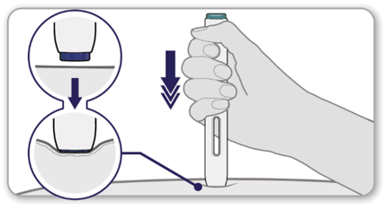 Press den åpne enden av pennen bestemt ned mot huden i en vinkel på 90 grader, slik at den lilla kanylebeskyttelsen er trykket helt inn i pennen.