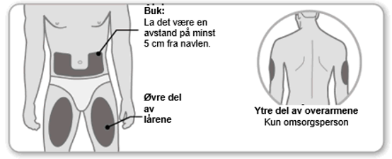 Velg et injeksjonssted midt på øvre del av låret foran eller i mageregionen 5 cm unna navlen. En omsorgsperson kan også bruke ytre del av overarmene.