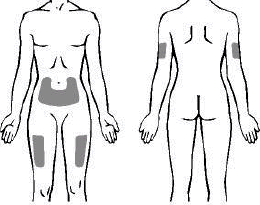 De tre anbefalte injeksjonsstedene for Enbrel omfatter: (1) midt på låret foran, (2) buken, med unntak av et fem centimeters område rundt navlen og (3) ytre del av overarmene (se figur 17). Hvis du injiserer selv, bør du ikke bruke overarmenes ytre område.
