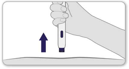 Press den åpne enden av pennen bestemt ned mot huden i en vinkel på 90 grader, slik at den lilla kanylebeskyttelsen er trykket helt inn i pennen.