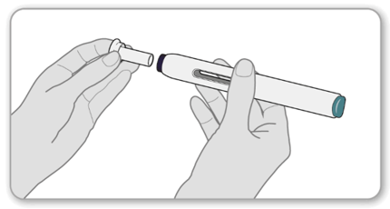 Etter at hetten har blitt fjernet, vil du se en lilla kanylebeskyttelse som stikker litt ut fra enden av pennen. Ikke skyv på kanylebeskyttelsen på enden med fingrene eller tommelen.