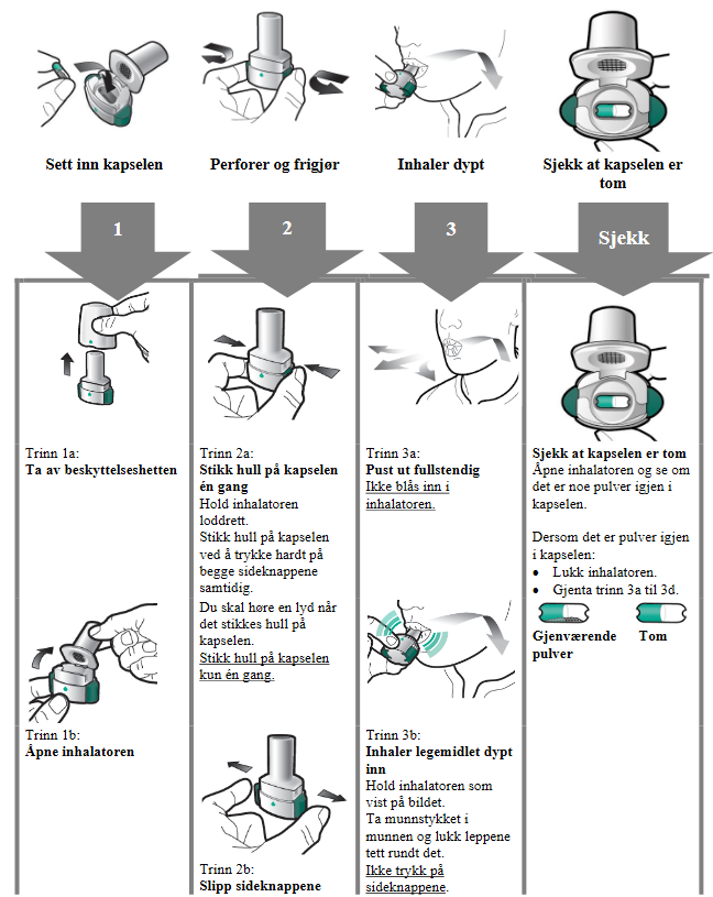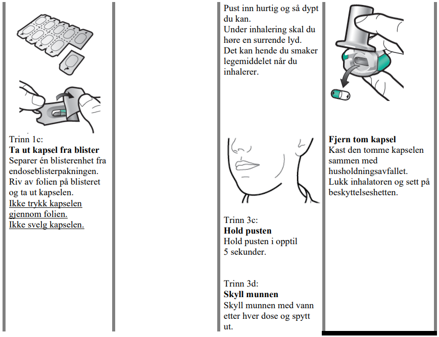 I denne pakningen finner du en inhalator og kapsler som inneholder legemidlet. Inhalatoren lar deg inhalere legemidlet som er i kapselen. Bruk kun kapslene sammen med inhalatoren vedlagt i denne pakningen. Kapslene skal være i blisteret inntil du skal bruke dem.