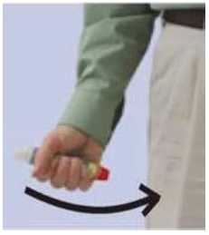1. Grip EpiPen med den hånden du vanligvis bruker (hånden du bruker til å skrive med). Hold tommelen nærmest den blå sikkerhetshetten og grip om autoinjektoren med den orange tuppen ned.