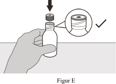 Sett «trykk-inn» flaskeadapteren inn i åpningen ved å trykke den ned med den andre hånden. Sørg for at den er fullstendig presset ned mot flasketoppen (se figur E).