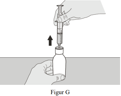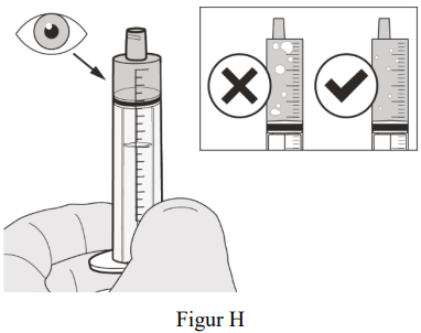 Hold den orale sprøyten med sprøytetuppen pekende oppover. Sjekk legemidlet i den orale sprøyten. Hvis det er store luftbobler i den orale sprøyten (se figur H) eller hvis du har dratt opp feil dosevolum med Evrysdi, sett sprøytetuppen godt inn i flaskeadapteren. Trykk stempelet hele veien ned, slik at legemidlet strømmer tilbake i flasken og gjenta steg A4 til A7. Ta eller gi Evrysdi umiddelbart etter at det er dratt opp i den orale sprøyten.