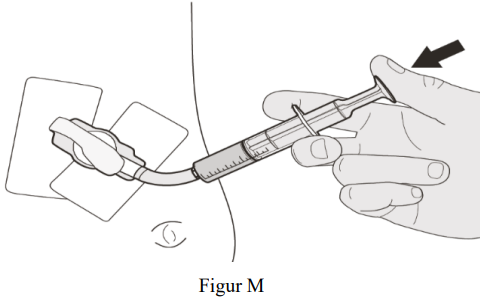 Steg C1 Plasser den orale sprøytetuppen inn i magesonden. Trykk stempelet sakte hele veien ned for å gi hele dosen med Evrysdi (se figur M). |