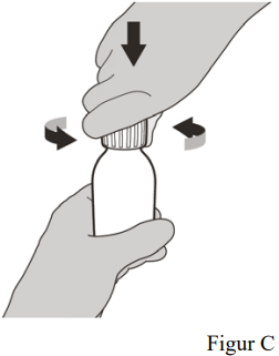 Steg 2 Fjern korken ved å trykke den ned og deretter skru den til venstre (mot klokken) (se figur C). Ikke kast korken. |