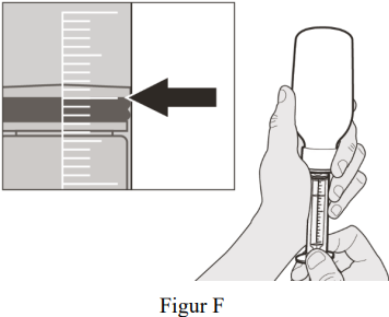 Dra stempelet sakte tilbake for å trekke ut din dose med Evrysdi. Toppen av det svarte stempelet må være på linje med ml-merket på den orale sprøyten, for å nå din daglige dose (se figur F).