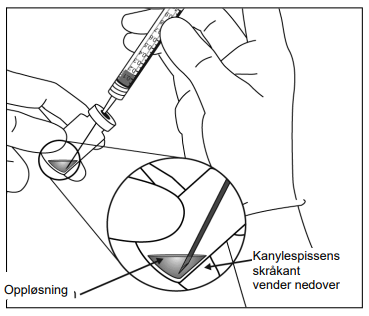 4. Bruk aseptisk teknikk og trekk hele innholdet med Eylea opp i sprøyten ved å holde hetteglasset i opprett posisjon og litt på skrå for å forenkle opptrekkingen. Sørg for at filterkanylens skråskjærte spiss er nede i væsken for å hindre at luft trekkes opp. Fortsett å holde hetteglasset på skrå under opptrekkingen slik at kanylens skråskjærte spiss er nede i væsken.