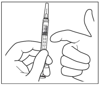 9. For å fjerne alle boblene og overflødig legemiddel, presses stempelet langsomt inn slik at den flate stempelkanten er på linje med streken som markerer 0,05 ml på sprøyten.