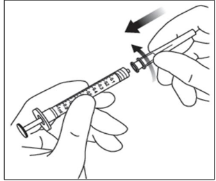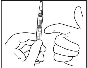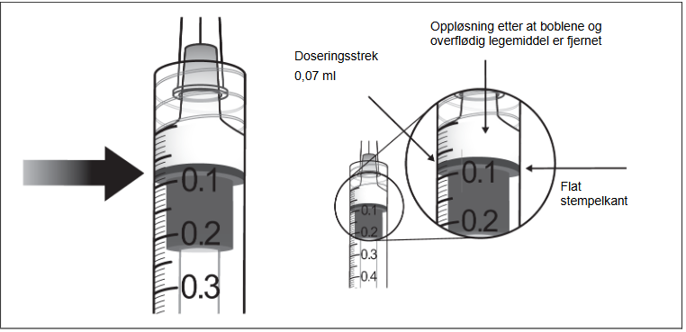 For å fjerne alle boblene og overflødig legemiddel, presses stempelet langsomt inn slik at den flate stempelkanten er på linje med streken som markerer 0,07 ml på sprøyten.