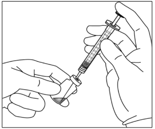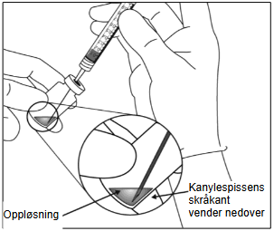 Trekk hele innholdet i hetteglasset med Eylea opp i sprøyten ved å holde hetteglasset i opprett posisjon og litt på skrå for å forenkle opptrekkingen. Sørg for at filterkanylens skråskjærte spiss er nede i væsken for å hindre at luft trekkes opp. Fortsett å holde hetteglasset på skrå under opptrekkingen slik at kanylens skråskjærte spiss er nede i væsken.