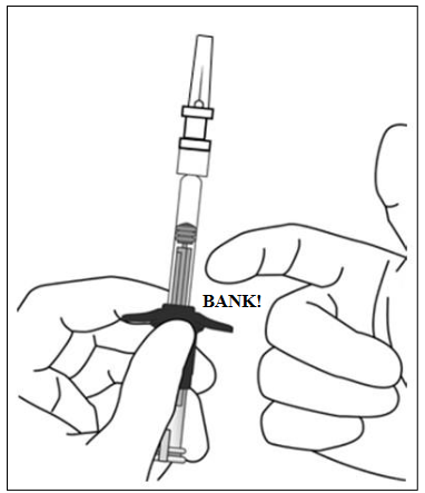 For å bryte av (ikke vri av) hetten på sprøyten skal du holde sprøyten i den ene hånden, mens du bruker den andre hånden til å ta tak i sprøytehetten med tommel- og pekefinger. Merk: Ikke trekk tilbake stempelstangen. |