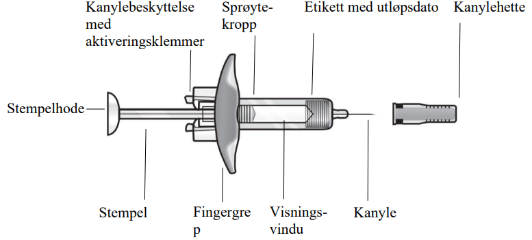 Dersom noe av det ovennevnte skjer, kast sprøyten i en punkteringssikker beholder beregnet for å kaste kanyler og bruk en ny ferdigfylt sprøyte.