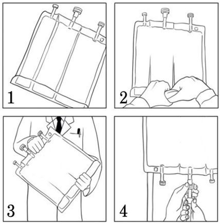 Rull posen manuelt opp på seg selv. Start i toppen av posen (med den enden den skal henge i) (bilde 1). De ikke-permanente forseglingene forsvinner fra siden ved inntakene. Fortsett å rulle posen til forseglingene er åpne i ca. halvparten av sin lengde (bilde 2).