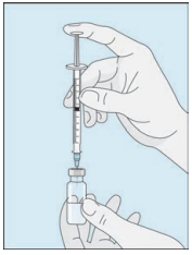Åpne hetteglasset med det sterile vannet til injeksjonsvæsker. Stikk kanylen inn i hetteglasset og snu hetteglasset med vann forsiktig opp ned. Pass på at spissen på kanylen alltid befinner seg under vannoverflaten for å hindre at luftbobler kommer inn i sprøyten.