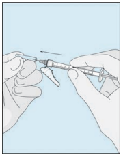 Trekk stempelet forsiktig tilbake for å få 1,0 ml med sterilt vann inn i sprøyten. Ta kanylen og sprøyten forsiktig ut av hetteglasset.
