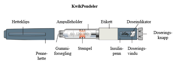 KwikPen («pennen») er en ferdigfylt engangspenn som inneholder 3 ml (300 enheter, 100 enheter/ml) insulin. Du kan sette flere doser med én penn. Pennen stilles med 1 enhet av gangen. Du kan injisere fra 1 til 60 enheter i én enkelt injeksjon. Dersom dosen din er høyere enn 60 enheter må du ta mer enn én injeksjon. Stempelet beveger seg bare litt ved hver injeksjon og det kan hende du ikke ser at det beveger seg. Stempelet når enden av ampullen kun når du har brukt alle 300 enhetene i pennen.