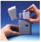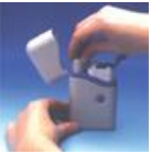 Trykk inn de blå knappene på siden med den ene hånden mens du trekker den brukte pakningen ut av etuiet med den andre hånden.
