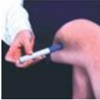Trykk med fingerspissen på den blå utløserknappen til du hører et klikk og hold GlaxoPen mot låret i 5 sekunder
