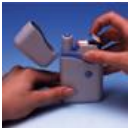 Sett injeksjonsvæsken ned i etuiet ved å trykke inn de blå knappene på siden.