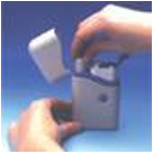 Trykk inn de blå knappene på siden med den ene hånden mens du trekker den brukte pakningen ut av etuiet med den andre hånden.
