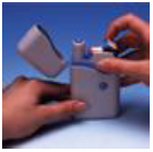 Sett injeksjonsvæsken ned i etuiet ved å trykke inn de blå knappene på siden.
