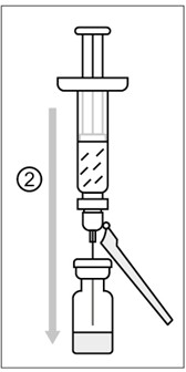 2) Rengjør hetteglassproppen. Innholdet i den ferdigfylte sprøyten (oppløsningsvæsken) overføres langsomt til hetteglasset (pulveret).