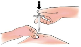 Ikke hold fingeren på stempelet mens du setter inn nålen.