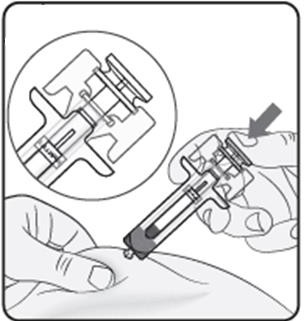 Hold den ferdigfylte sprøyten på injeksjonsstedet og slipp sakte stempelet helt til kanylen dekkes av kanyleskjoldet. Fjern den ferdigfylte sprøyten fra injeksjonsstedet.