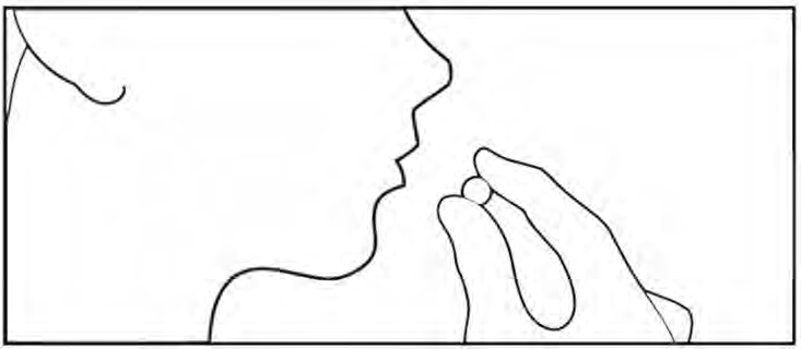 6. Svelg tabletten(e) med vann. Tablettene må svelges hele og ikke tygges eller løses opp i munnen. Hudkontakt bør begrenses. Unngå å røre ved nesen, øynene eller andre deler av kroppen.
