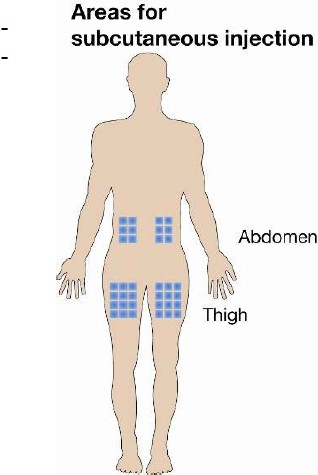 Ikke injiser i hud som er øm, har bloduttredelser, er rød, er hard eller har arr eller strekkmerker. Hvis du harpsoriasis, må du ikke forsøke å injisere rett inn i områder med hevede, tykke, røde eller flassende flekker eller lesjoner.