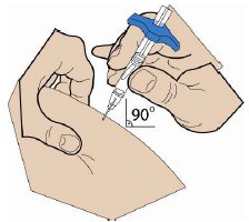 Bruk to fingre til å klemme sammen en hudfold, og stikk kanylen raskt inn i huden i 90 graders vinkel.