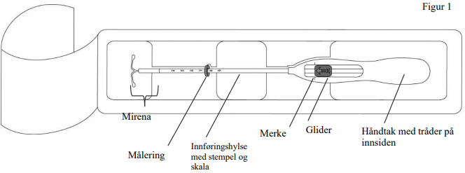 Mirena sitter i en innføringshylse som ligger i en steril pakning som ikke skal åpnes før umiddelbart før innsetting. Skal ikke steriliseres på nytt. Mirena er kun til engangsbruk. Skal ikke brukes dersom indre emballasje er skadd eller åpnet. Skal ikke settes inn etter utløpsdatoen (måned og år) som er angitt på etiketten.
