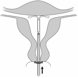 7. Mens du holder innføringshylsen på plass, frigjøres Mirena ved å skyve glideren helt tilbake (Figur 7). Mens du fortsatt holder glideren helt tilbake, fjernes innføringshylsen forsiktig ved å trekke den ut. Kutt trådene slik at 2-3 cm er synlig utenfor cervix.