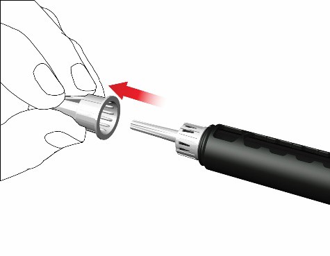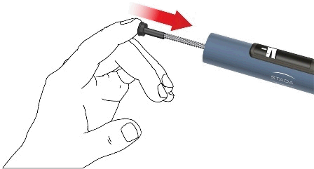 D: Skyv gjengestangen forsiktig med fingeren, i en rett linje og så langt som den går. Dette er ikke nødvendig når stangen allerede er i startposisjonen, for eksempel ved første bruk. Den gjengede stangen kan ikke skyves helt tilbake til pennhuset.