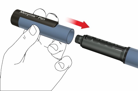 Når injeksjonen er ferdig settes beskyttelseshetten på kanylen og skrus mot klokken for å fjerne kanylen. Dette sikrer at Movymia forblir steril og hindrer lekkasje fra pennen. Det hindrer også at det kommer luft inn i sylinderampullen, samt at kanylen blir tilstoppet.