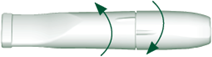 4. Når munnstykkets to deler settes sammen med markeringene rett ovenfor hverandre (se bilde), brytes forseglingene på hver side av dosebeholderen.