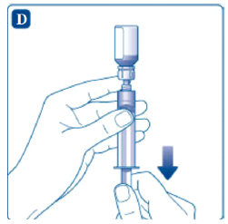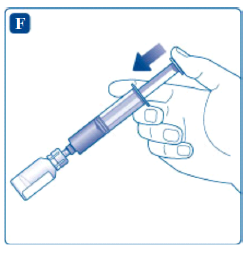 Klikk hetteglassadapteren, som fremdeles er festet til sprøyten, på hetteglasset med pulver. Hold sprøyten litt på skrå med hetteglasset vendt nedover. Skyv stempelet sakte for å injisere oppløsningsvæsken inn i hetteglasset med pulver. Pass på at strålen med oppløsningsvæske ikke rettes direkte på pulveret, da dette vil forårsake skumming.