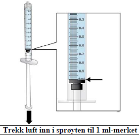 Trekk luft inn i sprøyten til markeringen for 1 ml.