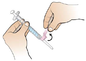 Trinn 3a: Fest stempelet av klar plast til den ferdigfylte sprøyten med sterilt vann ved å sette den gjengede enden av stempelet inn i sprøyten og forsiktig vri stempelet med klokken inn på det grå sprøytestempelet til du føler lett motstand. Ikke stram for mye.