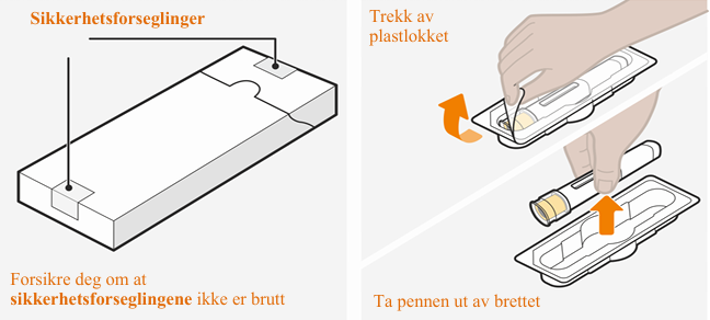 Pennen skal ikke brukes hvis sikkerhetsforseglingen på kartongen er brutt. Hetten skal ikke fjernes på dette trinnet. |