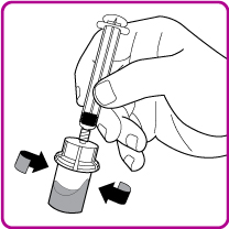 Mens du holder fast hetteglassadapterpakningen kobler du den ferdigfylte sprøyten med oppløsningsvæske til hetteglassadapteren ved å skyve sprøytespissen ned på Luer-locken i midten av hetteglassadapteren og vrir den med klokken til sprøyten er festet på plass. Ikke stram til for hardt (figur D).