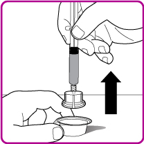 Vend hetteglasset. Press luften i sprøyten inn i hetteglasset og trekk den rekonstituerte OBIZUR-oppløsningen inn i sprøyten (figur I).