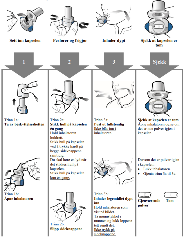 Les instruksjonen i slutten av dette pakningsvedlegget for mer informasjon om hvordan inhalatoren brukes.